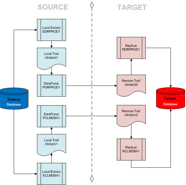 Fig 2. Data Flow in SOURCE – TARGET GoldenGate Configuration